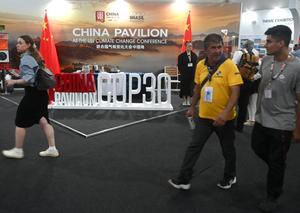 (251111) -- BELEM, 11 noviembre, 2025 (Xinhua) -- Personas caminan frente al Pabellón de China durante la 30ª Conferencia de las Partes (COP30) de la Convención Marco de las Naciones Unidas sobre el Cambio Climático, en Belém, en estado de Pará, Brasil, el 11 de noviembre de 2025. (Xinhua/Lucio Tavora) (lt) (jg) (ra) (ce)