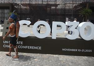 (251111) -- BELEM, 11 noviembre, 2025 (Xinhua) -- Un indígena camina frente al logotipo de la 30ª Conferencia de las Partes (COP30) de la Convención Marco de las Naciones Unidas sobre el Cambio Climático, en Belém, en estado de Pará, Brasil, el 11 de noviembre de 2025. (Xinhua/Lucio Tavora) (lt) (jg) (ra) (ce)