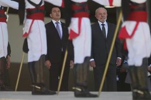 (250818) -- BRASILIA, 18 agosto, 2025 (Xinhua) -- El presidente brasileño, Luiz Inácio Lula da Silva (d), recibe al presidente ecuatoriano, Daniel Noboa (i), a su llegada para una visita oficial en el Palacio de Planalto, en Brasilia, Brasil, el 18 de agosto de 2025. Lula da Silva afirmó el lunes junto a su par de Ecuador, Daniel Noboa, que el escenario global exige "firmeza" para garantizar la independencia de los países. (Xinhua/Lucio Tavora) (lt) (rtg) (ah) (vf)