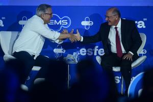 (250806) -- BRASILIA, 6 agosto, 2025 (Xinhua) -- El vicepresidente brasileño, Geraldo Alckmin (d), estrecha la mano del ministro de Salud brasileño, Alexandre Padilha (i) durante la 4 edición del Foro de Salud, en Brasilia, Brasil, el 6 de agosto de 2025. (Xinhua/Lucio Tavora) (lt) (ah) (ra) (vf)