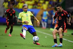 (250321) -- BRASILIA, 21 marzo, 2025 (Xinhua) -- Imagen del 20 de marzo de 2025 de Raphinha (i), de Brasil, disputando el balón con Daniel Muñoz, de Colombia, durante el partido de fútbol de las eliminatorias latinoamericanas para la Copa Mundial de la FIFA 2026 entre Brasil y Colombia, en Brasilia, Brasil. (Xinhua/Lucio Tavora) (rtg) (ra) (vf)