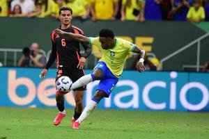 (250321) -- BRASILIA, 21 marzo, 2025 (Xinhua) -- Imagen del 20 de marzo de 2025 de Vinicius Junior (d), de Brasil, disputando el balón con Richard Ríos, de Colombia, durante el partido de fútbol de las eliminatorias latinoamericanas para la Copa Mundial de la FIFA 2026 entre Brasil y Colombia, en Brasilia, Brasil. (Xinhua/Lucio Tavora) (rtg) (ra) (vf)