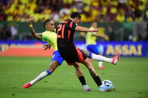 (250321) — BRASILIA, 21 marzo, 2025 (Xinhua) — Imagen del 20 de marzo de 2025 de Raphinha (i), de Brasil, disputando el balón con Daniel Muñoz, de Colombia, durante el partido de fútbol de las eliminatorias latinoamericanas para la Copa Mundial de la FIFA 2026 entre Brasil y Colombia, en Brasilia, Brasil. (Xinhua/Lucio Tavora) (rtg) (ra) (vf)