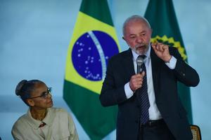 (250603) -- BRASILIA, 3 junio, 2025 (Xinhua) -- El presidente brasileño, Luiz Inácio Lula da Silva (d), habla junto la ministra de Medio Ambiente y Cambio Climático brasileña, Marina Silva (i), durante una ceremonia con motivo del Día Mundial del Medio Ambiente llevada a cabo en el Palacio de Planalto, en Brasilia, Brasil, 3 de junio de 2025. (Xinhua/Lucio Tavora) (lt) (jg) (ra) (ce)