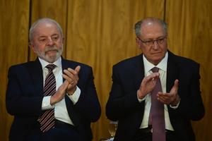 (250728) -- BRASILIA, 28 julio, 2025 (Xinhua) -- El presidente brasileño, Luiz Inácio Lula da Silva (i), y el vicepresidente brasileño, Geraldo Alckmin (d), reaccionan durante un evento en el Palacio de Planalto, en Brasilia, Brasil, el 28 de julio de 2025. Lula da Silva instó el lunes a su homólogo estadounidense, Donald Trump, a reconsiderar la decisión de aplicar un arancel del 50 por ciento a los productos brasileños a partir del 1 de agosto, y propuso resolver las diferencias a través del diálogo y la negociación. (Xinhua/Lucio Tavora) (lt) (oa) (ah) (vf)