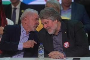 (251017) -- BRASILIA, 17 octubre, 2025 (Xinhua) -- Imagen del 16 de octubre de 2025 del presidente brasileño, Luiz Inácio Lula da Silva (i), conversando con el diputado federal brasileño, Renildo Calheiros (d), durante el congreso nacional del Partido Comunista de Brasil, en Brasilia, Brasil. Lula da Silva defendió el jueves a Venezuela ante el incremento de las acciones del Gobierno del presidente estadounidense, Donald Trump, en relación con el país sudamericano, y reiteró que ningún mandatario extranjero tiene derecho a interferir en sus asuntos internos. (Xinhua/Lucio Tavora) (lt) (jg) (da) (ce)