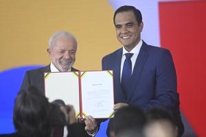 (251223) -- BRASILIA, 23 diciembre, 2025 (Xinhua) -- El presidente brasileño, Luiz Inácio Lula da Silva (i), y el nuevo ministro de Turismo brasileño, Gustavo Feliciano (d), sostienen un documento durante su ceremonia de toma de posesión del cargo, en el Palacio de Planalto, en Brasilia, Brasil, el 23 de diciembre de 2025. (Xinhua/Lucio Tavora) (lt) (jg) (ra) (vf)