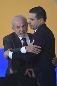 (251223) -- BRASILIA, 23 diciembre, 2025 (Xinhua) -- El presidente brasileño, Luiz Inácio Lula da Silva (i), saluda al presidente de la Cámara de Diputados de Brasil, Hugo Motta (d), durante la ceremonia de toma de posesión del cargo del nuevo ministro de Turismo brasileño, Gustavo Feliciano, en el Palacio de Planalto, en Brasilia, Brasil, el 23 de diciembre de 2025. (Xinhua/Lucio Tavora) (lt) (jg) (ra) (vf)