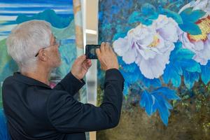 (250410) — GOIANIA, 10 abril, 2025 (Xinhua) — Imagen del 9 de abril de 2025 de un visitante tomando fotografías de una pintura china durante un evento cultural chino, en Goiania, estado de Goiás, Brasil. Un evento sobre la cultura tradicional china fue inaugurado el miércoles en la Asamblea Legislativa del Estado de Goiás, atrayendo a numerosos visitantes locales. (Xinhua/Wang Tiancong) (jg) (ah) (ce)