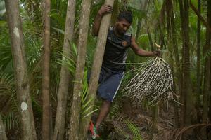 (251003) -- ISLA DE MARAJO, 3 octubre, 2025 (Xinhua) -- Imagen del 2 de octubre de 2025 de un trabajador recolectando frutos de acaí en una finca, en la Isla de Marajó, en el estado de Pará, Brasil. (Xinhua/Lucio Tavora) (lt) (jg) (rtg) (vf)