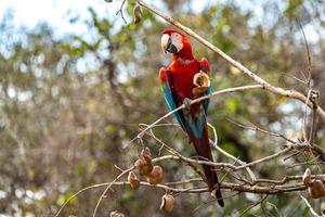 (250809) -- MATO GROSSO DO SUL, 9 agosto, 2025 (Xinhua) -- Imagen del 7 de agosto de 2025 de una guacamaya roja alimentándose sobre una rama de un árbol, en el Pantanal Sur, en la ciudad de Miranda, en el estado de Mato Grosso do Sul, Brasil. (Xinhua/Paulo Lopes) (pl) (jg) (da)