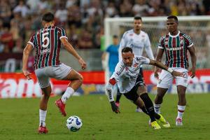 (250414) -- RIO DE JANEIRO, 14 abril, 2025 (Xinhua) -- Imagen del 13 de abril de 2025 del jugador Facundo Bernal (i), de Fluminense, disputando el balón con Neymar (c), de Santos, durante el partido correspondiente a la jornada 3 del Campeonato Brasileño Serie A, celebrado en el Estadio Maracaná, en Río de Janeiro, Brasil. (Xinhua/Claudia Martini) (cm) (rtg) (ah) (vf)