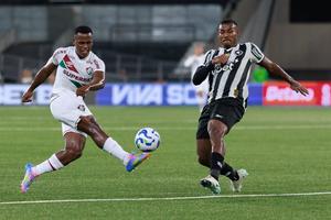 (250427) -- RIO DE JANEIRO, 27 abril, 2025 (Xinhua) -- Imagen del 26 de abril de 2025 del jugador Cuiabano (d), de Botafogo, disputando el balón con Jhon Arias (i), de Fluminense, durante el partido correspondiente a la jornada 6 del Campeonato Brasileño Serie A, celebrado en el Estadio Nilton Santos, en Río de Janeiro, Brasil. (Xinhua/Claudia Martini) (cm) (oa) (da)