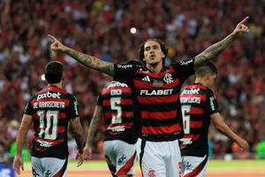 (250428) -- RIO DE JANEIRO, 28 abril, 2025 (Xinhua) -- Imagen del 27 de abril de 2025 del jugador Pedro (frente), de Flamengo, festejando su anotación durante el partido correspondiente a la jornada 6 del Campeonato Brasileño Serie A, ante Corinthians, celebrado en el Estadio Maracaná, en Río de Janeiro, Brasil. (Xinhua/Claudia Martini) (cm) (oa) (ah) (ce)