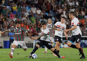 (251128) — RIO DE JANEIRO, 28 noviembre, 2025 (Xinhua) — Imagen del 27 de noviembre de 2025 del jugador Luciano Acosta (i), de Fluminense, disputando el balón con Felipe Negrucci (2-d), de Sao Paulo, durante el partido correspondiente a la jornada 36 del Campeonato Brasileño Serie A, celebrado en el Estadio Maracaná, en Río de Janeiro, Brasil. (Xinhua/Claudia Martini) (cm) (rtg) (ra) (vf)