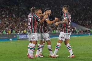 (251128) -- RIO DE JANEIRO, 28 noviembre, 2025 (Xinhua) -- Imagen del 27 de noviembre de 2025 del jugador Nonato (2-d), de Fluminense, festejando su anotación junto a sus compañeros de equipo durante el partido correspondiente a la jornada 36 del Campeonato Brasileño Serie A, ante Sao Paulo, celebrado en el Estadio Maracaná, en Río de Janeiro, Brasil. (Xinhua/Claudia Martini) (cm) (rtg) (ra) (vf)