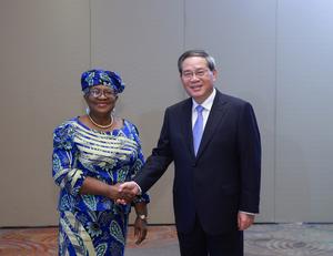 (250708) -- RIO DE JANEIRO, 8 julio, 2025 (Xinhua) -- El primer ministro chino, Li Qiang, se reúne con la directora general de la Organización Mundial del Comercio (OMC), Ngozi Okonjo-Iweala, en Río de Janeiro, Brasil, el 7 de julio de 2025. (Xinhua/Wang Ye) (jg) (ra) (ce)