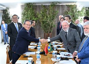 (250706) -- RIO DE JANEIRO, 6 julio, 2025 (Xinhua) -- El primer ministro chino, Li Qiang, se reúne con el presidente brasileño, Luiz Inácio Lula da Silva, en Río de Janeiro, Brasil, el 5 de julio de 2025. (Xinhua/Li Xiang) (rtg) (ah)
