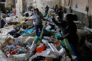 (250605) -- RIO DE JANEIRO, 5 junio, 2025 (Xinhua) -- Imagen del 4 de junio de 2025 de trabajadores clasificando residuos reciclables en una cooperativa de reciclaje, en Río de Janeiro, Brasil. En la zona norte de Río de Janeiro, varias cooperativas de reciclaje promueven el desarrollo de una economía circular mediante la organización de forma estructurada de la recolección y reutilización de materiales reciclables urbanos. (Xinhua/Claudia Martini) (jg) (da) (vf)