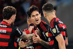 (250919) -- RIO DE JANEIRO, 19 septiembre, 2025 (Xinhua) -- Imagen del 18 de septiembre de 2025 del jugador Pedro (c), de Flamengo de Brasil, festejando su anotación junto a sus compañeros de equipo durante el partido de ida correspondiente a los cuartos de final de la Copa Conmebol Libertadores, ante Estudiantes de Argentina, celebrado en el Estadio Maracaná, en Río de Janeiro, Brasil. (Xinhua/Claudia Martini) (cm) (rtg) (ra) (vf)