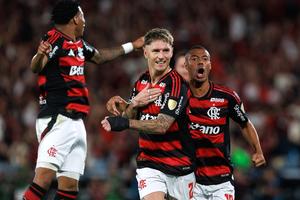 (250919) -- RIO DE JANEIRO, 19 septiembre, 2025 (Xinhua) -- Imagen del 18 de septiembre de 2025 del jugador Guillermo Varela (c), de Flamengo de Brasil, festejando su anotación junto a sus compañeros de equipo durante el partido de ida correspondiente a los cuartos de final de la Copa Conmebol Libertadores, ante Estudiantes de Argentina, celebrado en el Estadio Maracaná, en Río de Janeiro, Brasil. (Xinhua/Claudia Martini) (cm) (rtg) (ra) (vf)