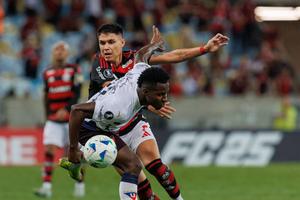 (250516) -- RIO DE JANEIRO, 16 mayo, 2025 (Xinhua) -- Imagen del 15 de mayo de 2025 del jugador Luiz Araújo (atrás), de Flamengo de Brasil, disputando el balón con Leonel Quiñónez (frente) de Liga Deportiva Universitaria de Quito de Ecuador, durante el partido del Grupo C de la jornada 5 de la fase de grupos de la Copa Conmebol Libertadores, celebrado en el Estadio Maracaná, en Río de Janeiro, Brasil. (Xinhua/Claudia Martini) (cm) (rtg) (ra) (vf)