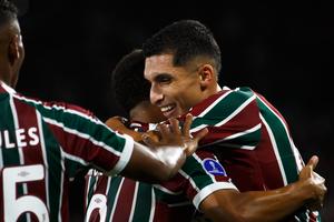 (250820) -- RÍO DE JANEIRO, 20 agosto, 2025 (Xinhua) -- Imagen del 19 de agosto de 2025 del jugador Kevin Serna, de Fluminense, de Brasil, festejando su anotación con sus compañeros durante el partido de vuelta de los octavos de final de la Copa Conmebol Sudamericana ante América de Cali, de Colombia, en el Estadio Maracaná, en Río de Janeiro, Brasil. (Xinhua/Claudia Martini) (cm) (da) (ce)