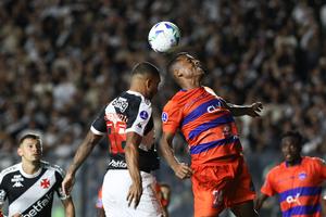 (250409) -- RIO DE JANEIRO, 9 abril, 2025 (Xinhua) -- Imagen del 8 de abril de 2025 del jugador, Paulo Henrique (2-i), de Vasco da Gama, de Brasil, disputando el balón con Harrison Contreras (2-d), de Academia Puerto Cabello, de Venezuela, durante el partido del grupo G de la jornada 2 de la Fase de Grupos de la Copa Conmebol Sudamericana, celebrado en el Estadio Sao Januário, en Río de Janeiro, Brasil. (Xinhua/Claudia Martini) (cm) (ah) (ra) (ce)