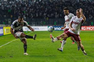 (250423) -- RIO DE JANEIRO, 23 abril, 2025 (Xinhua) -- Imagen del 22 de abril de 2025 del jugador Paulo Henrique (i), de Vasco da Gama de Brasil, disputando el balón con Sasha Marcich (d-frente), de Lanús de Argentina, durante el partido del grupo G de la jornada 3 de la Fase de Grupos de la Copa Conmebol Sudamericana, celebrado en el Estadio Sao Januário, en Río de Janeiro, Brasil. (Xinhua/Claudia Martini) (cm) (ah) (ra) (vf)