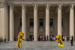 (250208) -- RIO DE JANEIRO, 8 febrero, 2025 (Xinhua) -- Imagen del 6 de febrero de 2025 de bailarines de la danza del león realizando una presentación durante un evento en celebración de la Fiesta de la Primavera frente al Palacio Tiradentes, en Río de Janeiro, Brasil. (Xinhua/Claudia Martini) (oa) (da)