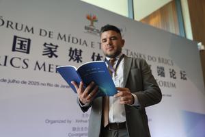 (250717) -- RÍO DE JANEIRO, 17 julio, 2025 (Xinhua) -- Imagen del 16 de julio de 2025 de un delegado informándose sobre un informe titulado El Ascenso del Sur Global mientras asiste al Foro de Medios de Comunicación y Think Tanks del BRICS, en Río de Janeiro, Brasil. Un informe multilingüe titulado El Ascenso del Sur Global fue presentado el miércoles por la Agencia de Noticias Xinhua durante el Foro de Medios de Comunicación y Think Tanks del BRICS. El informe, publicado en chino, inglés y español, compila la investigación de Xinhua en el último año acerca del desarrollo independiente y la revitalización de los países del Sur Global, mostrando las prácticas innovadoras que sustentan el ascenso colectivo del Sur Global en medio de las profundas transformaciones del mundo. (Xinhua/Li Mengxin) (jg) (ah) (ce)