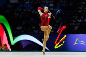 (250822) -- RIO DE JANEIRO, 22 agosto, 2025 (Xinhua) -- Imagen del 21 de agosto de 2025 de Wang Zilu, de China, compitiendo en la ronda de clasificación individual de cinta durante el 41 Campeonato Mundial de Gimnasia Rítmica de la FIG, en Río de Janeiro, Brasil. (Xinhua/Claudia Martini) (oa) (ra) (ce)