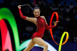 (250822) -- RIO DE JANEIRO, 22 agosto, 2025 (Xinhua) -- Imagen del 21 de agosto de 2025 de Wang Zilu, de China, compitiendo en la ronda de clasificación individual de cinta durante el 41 Campeonato Mundial de Gimnasia Rítmica de la FIG, en Río de Janeiro, Brasil. (Xinhua/Claudia Martini) (oa) (ra) (ce)