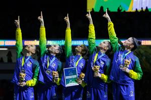 (250825) -- RIO DE JANEIRO, 25 agosto, 2025 (Xinhua) -- Imagen del 24 de agosto de 2025 de las medallistas de plata, el equipo de Brasil, reaccionando durante la ceremonia de premiación de la final de 3 pelotas y dos aros grupal, en el 41 Campeonato Mundial de Gimnasia Rítmica de la FIG, en Río de Janeiro, Brasil. (Xinhua/Claudia Martini) (rtg) (ah) (ce)