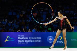 (250821) -- RIO DE JANEIRO, 21 agosto, 2025 (Xinhua) -- Imagen del 20 de agosto de 2025 de Hung Ka Yi, de Hong Kong de China, compitiendo en la ronda de clasificación individual de aro durante el 41 Campeonato Mundial de Gimnasia Rítmica de la FIG, en Río de Janeiro, Brasil. (Xinhua/Claudia Martini) (rtg) (ra) (ce)