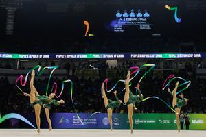 (250825) -- RIO DE JANEIRO, 25 agosto, 2025 (Xinhua) -- Imagen del 24 de agosto de 2025 del equipo de China compitiendo durante la final de 5 cintas grupal, en el 41 Campeonato Mundial de Gimnasia Rítmica de la FIG, en Río de Janeiro, Brasil. (Xinhua/Claudia Martini) (rtg) (ah) (ce)