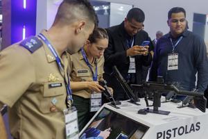 (250402) -- RIO DE JANEIRO, 2 abril, 2025 (Xinhua) -- Imagen del 1 de abril de 2025 de visitantes observando equipamiento de defensa y seguridad en la feria LAAD Defence & Security 2025, en Río de Janeiro, Brasil. La exposición de cuatro días comenzó aquí el martes, con la participación de más de 400 marcas de 45 países y regiones. (Xinhua/Claudia Martini) (ah) (ra) (vf)