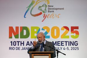 (250704) -- RIO DE JANEIRO, 4 julio, 2025 (Xinhua) -- El presidente de Brasil, Luiz Inácio Lula da Silva, reacciona durante la ceremonia de apertura de la décima reunión del Consejo de Gobernadores del Nuevo Banco de Desarrollo (NDB, siglas en inglés) del grupo de BRICS, en Río de Janeiro, Brasil, el 4 de julio de 2025. Lula da Silva defendió el viernes la creación de un nuevo modelo mundial de financiación para los países en desarrollo y destacó el uso de monedas locales para los proyectos del NDB del grupo de BRICS. (Xinhua/Claudia Martini) (cm) (jg) (da) (vf)