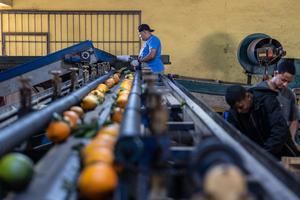 (250820) — RÍO DE JANEIRO, 20 agosto, 2025 (Xinhua) — Imagen del 19 de agosto de 2025 de trabajadores vistos en un centro de clasificación de naranjas, en Tanguá, Río de Janeiro, Brasil. Brasil es uno de los principales productores y exportadores mundiales de jugo de naranja. La temporada de cosecha en los huertos de naranjos de todo el país se extiende de agosto a septiembre de cada año. (Xinhua/Wang Tiancong) (jg) (ra) (ce)