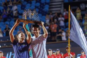 (250223) -- RÍO DE JANEIRO, 23 febrero, 2025 (Xinhua) -- Marcelo Melo (d) y Rafael Matos (i), de Brasil, sostienen el trofeo durante la ceremonia de premiación al término de la final de dobles masculinos ante Pedro Martínez y Jaume Munar, de España, en el Río Open de la ATP 500 2025, en el Jockey Club Brasileiro, en Río de Janeiro, Brasil, durante las primeras horas del 23 de febrero de 2025. (Xinhua/Claudia Martini) (cm) (rtg) (da)