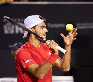 (250221) -- RIO DE JANEIRO, 21 febrero, 2025 (Xinhua) -- Imagen del 20 de febrero de 2025 de Francisco Cerundolo, de Argentina, reaccionando durante el partido de octavos de final de individuales masculinos ante Luciano Darderi, de Italia, en el Río Open de la ATP 500 2025, en el Jockey Club Brasileiro, en Río de Janeiro, Brasil. (Xinhua/Wang Tiancong) (rtg) (ra) (vf)