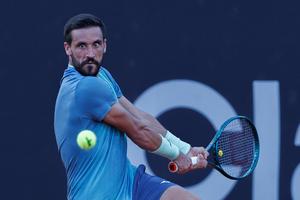(250221) -- RIO DE JANEIRO, 21 febrero, 2025 (Xinhua) -- Imagen del 20 de febrero de 2025 de Damir Dzumhur, de Bosnia y Herzegovina, devolviendo la pelota durante el partido de octavos de final de individuales masculinos ante Camilo Ugo Carabelli, de Argentina, en el Río Open de la ATP 500, en el Jockey Club Brasileiro, en Río de Janeiro, Brasil. (Xinhua/Claudia Martini) (rtg) (ra) (vf)