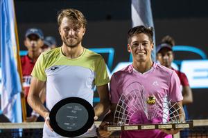 (250224) -- RIO DE JANEIRO, 24 febrero, 2025 (Xinhua) -- Imagen del 23 de febrero de 2025 de Alexandre Muller (i), de Francia y Sebastián Báez, de Argentina, posando para fotografías durante la ceremonia de premiación al término del partido final de individuales masculinos, en el Rio Open de la ATP 500 2025 en el Jockey Club Brasileiro, en Río de Janeiro, Brasil. (Xinhua/Wang Tiancong) (rtg) (ah) (vf)