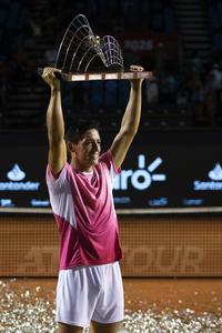 (250224) -- RIO DE JANEIRO, 24 febrero, 2025 (Xinhua) -- Imagen del 23 de febrero de 2025 de Sebastián Báez, de Argentina, posando con su trofeo durante la ceremonia de premiación después de ganar el partido final de individuales masculinos ante Alexandre Muller, de Francia, en el Rio Open de la ATP 500 2025 en el Jockey Club Brasileiro, en Río de Janeiro, Brasil. (Xinhua/Claudia Martini) (rtg) (ah) (vf)