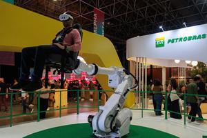 (250428) -- RIO DE JANEIRO, 28 abril, 2025 (Xinhua) -- Un asistente prueba un dispositivo de realidad virtual en el estand de Petrobras durante la Web Summit Rio 2025, en Río de Janeiro, Brasil, el 28 de abril de 2025. (Xinhua/Claudia Martini) (cm) (rtg) (ah) (ce)