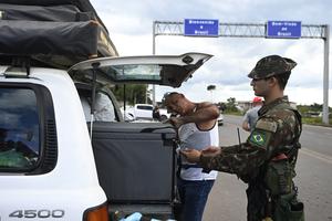(260107) -- PACARAIMA, 7 enero, 2026 (Xinhua) -- Imagen del 6 de enero de 2026 de un soldado del Ejército brasileño inspeccionando un vehículo cerca de la frontera entre Brasil y Venezuela, en Pacaraima, Roraima, Brasil. (Xinhua/Lucio Tavora) (ah) (vf)