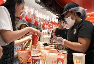 (260411) -- SAO PAULO, 11 abril, 2026 (Xinhua) -- Una trabajadora atiende a una clienta en la primera tienda china Mixue en Brasil durante su inauguración en un centro comercial, en Sao Paulo, Brasil, el 11 de abril de 2026. Mixue abrió su primera tienda en Brasil y según un representante de la empresa también comenzará la construcción de una fábrica para su cadena de suministro en el país. Se espera que genere 25.000 empleos en el futuro. (Xinhua/Paulo Lopes) (pl) (jg) (da)