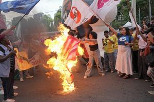 (260106) — SAO PAULO, 6 enero, 2026 (Xinhua) — Imagen del 5 de enero de 2026 de manifestantes quemando una bandera nacional estadounidense durante una protesta en contra del ataque de Estados Unidos a Venezuela, en Sao Paulo, Brasil. Varios gobiernos latinoamericanos, de diferentes signos políticos, condenaron el sábado la agresión lanzada por Estados Unidos contra Venezuela y la captura del presidente venezolano, Nicolás Maduro, y de su esposa, Cilia Flores. (Xinhua/Paulo Lopes) (pl) (oa) (ah) (vf)