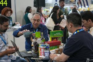 (250410) -- SAO PAULO, 10 abril, 2025 (Xinhua) -- Imagen del 9 de abril de 2025 de vendedores interactuando con visitantes en la feria internacional de alimentos y bebidas "Anuga Select Brasil", en Sao Paulo, Brasil. (Xinhua/Paulo Lopes) (pl) (jg) (ah) (ce)