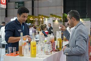 (250410) -- SAO PAULO, 10 abril, 2025 (Xinhua) -- Imagen del 9 de abril de 2025 de un vendedor interactuando con un visitante en la feria internacional de alimentos y bebidas "Anuga Select Brasil", en Sao Paulo, Brasil. (Xinhua/Paulo Lopes) (pl) (jg) (ah) (ce)